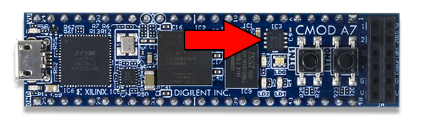 Due to a component for the Cmod A7 going end-of-life, your board may feature one of several different Quad SPI Flash parts. The Quad SPI Flash memory on any particular Cmod A7 can be found in Table 4.1 below. To determine which part is used by a particular board, look at the part number printed on IC3 on the top of the Cmod A7 (See Figure 4.2). Datasheets for each flash part can be found on their respective manufacturer's website.